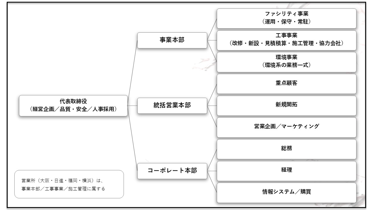 当社は、様々な施設や店舗・工場などのトータルメンテナンス事業を中心に、空調設備事業、工事現場の荷揚げ事業など、幅広い範囲を対象に全国各地で業務展開して参りました。